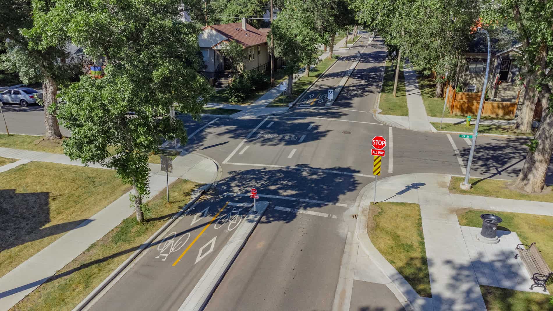 The project features the integration of unique transportation, planning and streetscape elements including new protected bike facilities, raised and on-street bike lanes, new shared-use roadways and the introduction of new seating nodes and plantings throughout the neighbourhood.